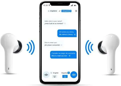 bezproblémový simultánní překlad) pro vedení konverzace, když má každá osoba nasazena sluchátka. Druhým režimem je režim reproduktoru pro krátkodobý a jednoduchý rozhovor s 1 sluchátkem + 1 telefonem pomocí překladu a čtení pomocí reproduktoru telefonu. Druhý režim je zvláště užitečný v současném pandemickém období.
